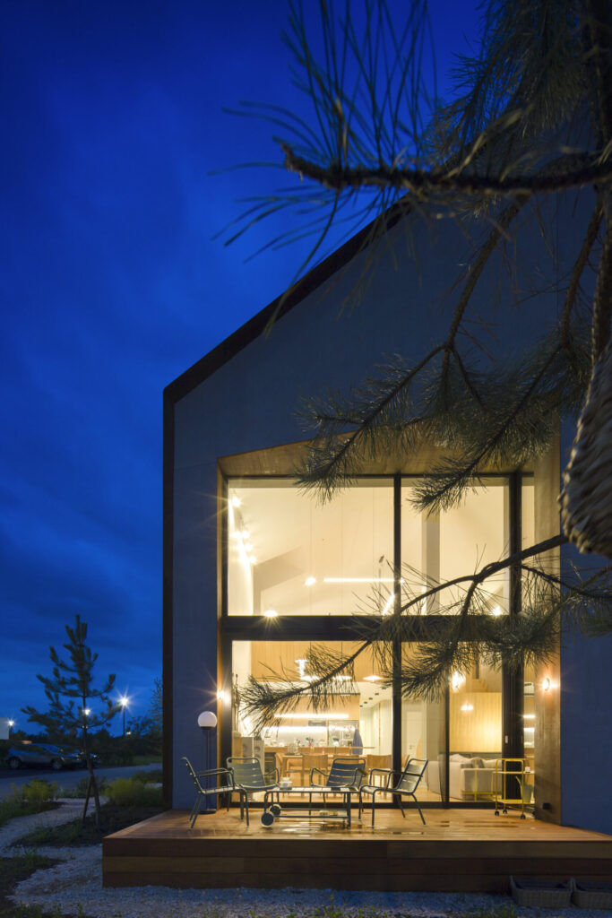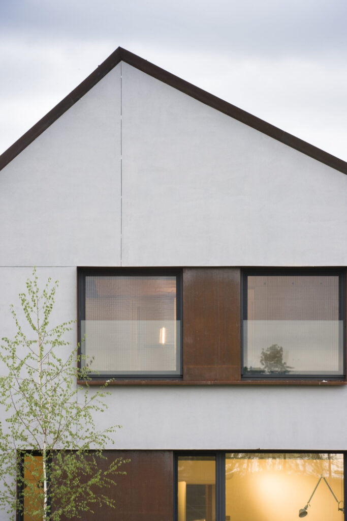 Casa are forma unei locuințe de tip „gable house”, cu acoperiș în două ape inegale, asimetrice. Volumul simplu este animat de câteva decupaje atent gândite: zona de zi deschisă spre exterior, intrarea principală accentuată și o singură lucarnă amplasată în acoperiș. Toate aceste elemente sunt orientate către strada principală și dau casei un caracter puternic și recognoscibil.