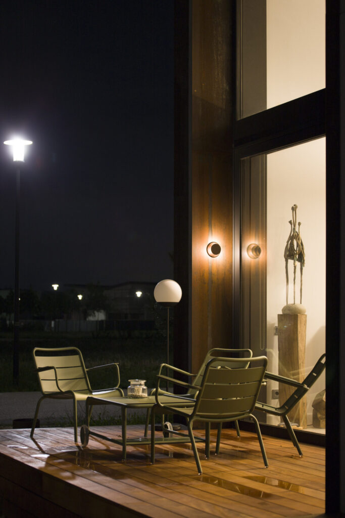 Amplasată la intersecția a două străzi, casa este vizibilă și expusă, ceea ce i-a conferit un caracter mai deschis către exterior. Totuși, prima impresie este una de soliditate și discreție, echilibrată de decupajele intrării și ale lucarnei, dar și de mobilierul exterior, care invită la relaxare în fața casei. Vegetația bogată, atent îngrijită, completează treptat această percepție și îndulcește volumul construit.