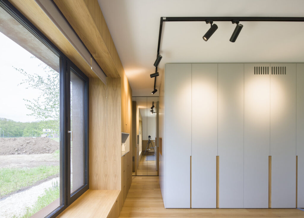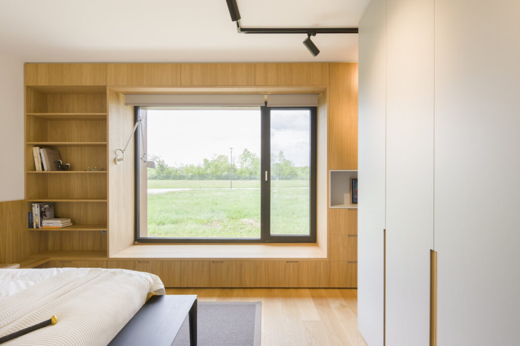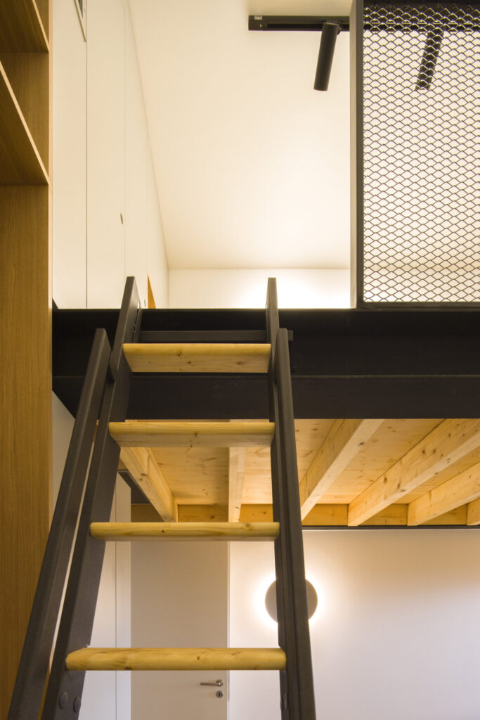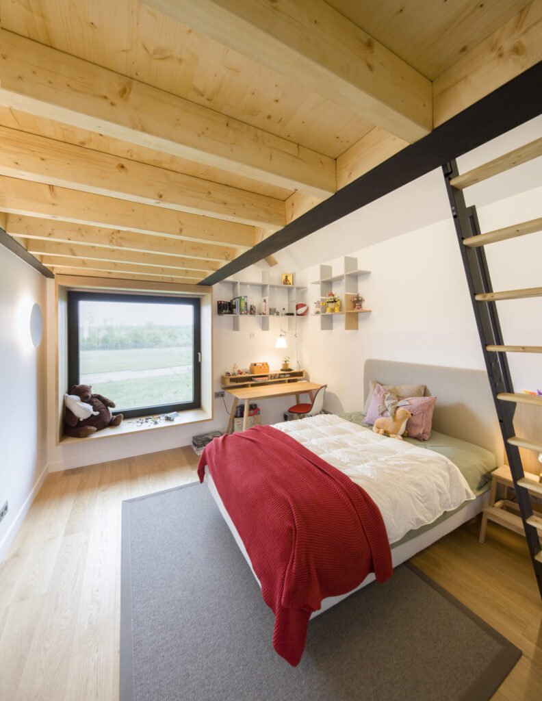 Dormitoarele copiilor sunt amplasate sub acoperiș, iar unul dintre ele include o mică supantă, gândită ca spațiu de joacă. Lemnul cald al pardoselilor contrastează cu elementele metalice brute, păstrând un echilibru vizual plăcut. Ferestrele sunt tratate ca zone de refugiu, cu pervazuri late care pot fi folosite ca băncuțe pentru citit, integrate în mobilier personalizat din stejar.