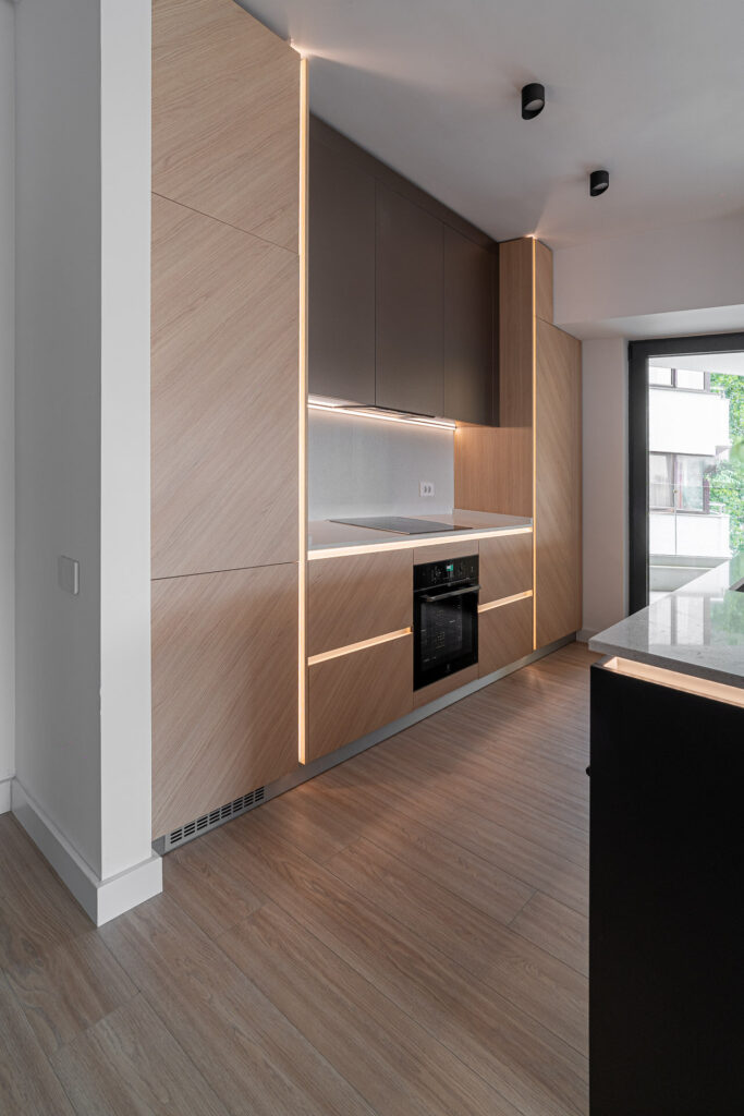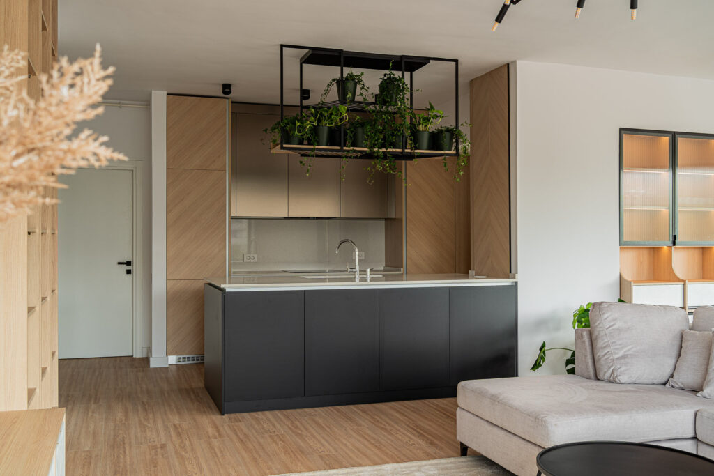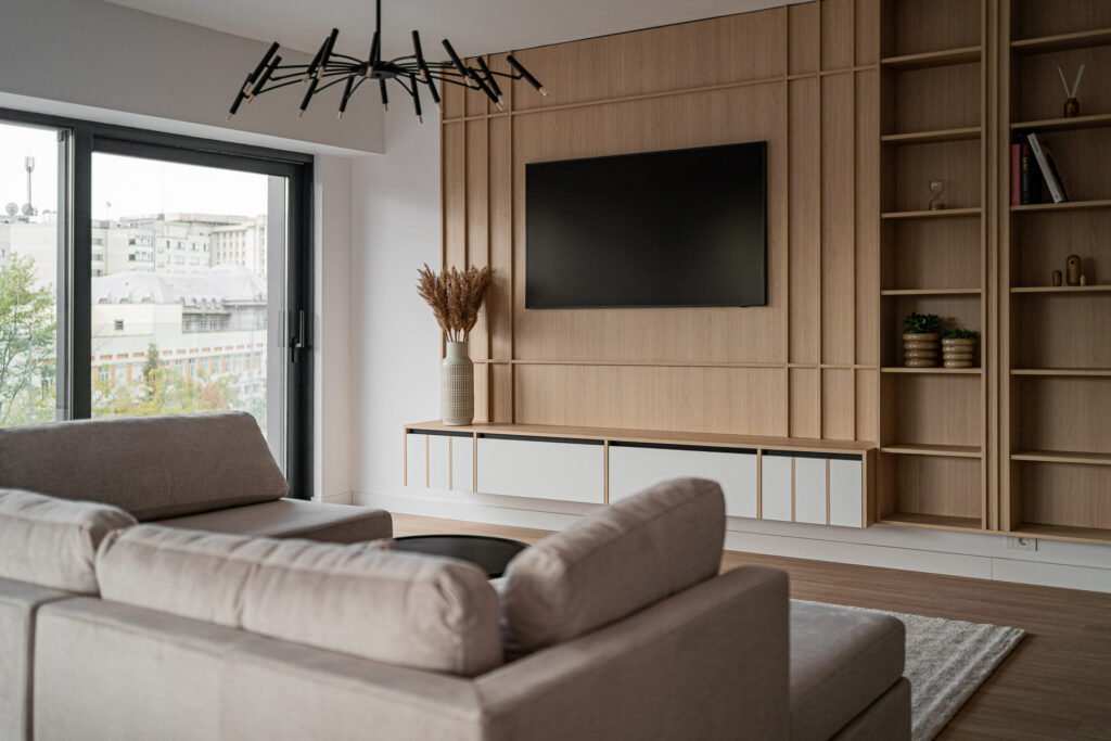Foto: Vlad Creteanu Interior contemporan, unde lemnul în ton cald dă tonul amenajării 20 ianuarie 2026 | Case și amenajări | Petri Radulescu Distribuie articolul pe: Acest apartament din zona Cotroceni este un bun exemplu de amenajare contemporană echilibrată, în care funcționalitatea zilnică se îmbină firesc cu o estetică atent gândită. Întregul proiect pornește de la ideea de coerență: materiale bine alese, culori temperate și un limbaj vizual unitar, care creează o locuință caldă, aerisită și ușor de trăit. Încă de la intrare, atmosfera este una primitoare. Lemnul în ton cald apare atât pe pardoseală, cât și în mobilier, și leagă vizual toate încăperile. Această continuitate oferă senzația de spațiu bine organizat și aduce un plus de confort. Lemnul nu este folosit excesiv, ci ca fundal, lăsând loc accentelor din metal, sticlă și plantelor decorative să aducă un plus de personalitate. Bucătăria este una dintre zonele-cheie ale apartamentului și este integrată natural în zona de zi. Mobilierul combină fronturi în nuanțe închise de antracit cu elemente din lemn deschis, într-un ton cald, ușor auriu. Această combinație creează contrast, dar păstrează echilibrul vizual. Insula de bucătărie devine un element central, atât din punct de vedere estetic, cât și funcțional, iar iluminarea LED discretă subliniază liniile clare ale mobilierului. Suspensia metalică neagră, care integrează și plante decorative, adaugă verticalitate și dinamism spațiului. Zona de living este bine delimitată, dar rămâne fluidă, fără senzația de aglomerare. Mobilierul suspendat, cu detalii din sticlă și iluminare de accent, contribuie la un aspect modern și aerisit. Culorile neutre, completate de textile naturale și plante, creează o atmosferă relaxantă, potrivită atât pentru momentele de odihnă, cât și pentru socializare. Dormitorul continuă aceeași linie calmă și coerentă. Mobilierul este simplu, compact și bine integrat, fără elemente inutile. Finisajele mate și corpurile de iluminat suspendate, amplasate la înălțimi diferite, aduc un plus de dinamism, fără a încărca vizual spațiul. Oglinzile sunt folosite inteligent pentru a reflecta lumina naturală, mai ales în zona dressingului, unde compartimentarea este clară și eficientă. Baia păstrează același limbaj contemporan, bazat pe materiale naturale și tonuri neutre. Zona de duș este separată printr-un paravan de sticlă transparentă, ceea ce face ca spațiul să pară mai mare și mai luminos. Mobilierul suspendat și obiectele sanitare albe contribuie la un aspect curat, minimalist, dar confortabil. Un plus important al apartamentului este terasa generoasă, gândită ca o extensie a zonei de zi. Peretele placat cu riflaj vertical din lemn temperează lumina și adaugă textură spațiului exterior. Mobilată simplu, terasa devine un loc ideal pentru relaxare, citit sau întâlniri cu prietenii. Iluminatul joacă un rol esențial în întreaga amenajare. Benzile LED, luminile de accent și corpurile suspendate nu sunt doar funcționale, ci ajută la definirea volumelor și la crearea unei atmosfere calde, primitoare, mai ales seara. Proiectul arh. Cristiana Zgripcea și arh. Ciprian David face parte din proiectele înscrise la Secțiunea Arhitectura amenajărilor interioare / Amenajări rezidențiale 2025 de la Anuala de Arhitectură București. Anuala de Arhitectură București este realizată în fiecare an de către Filiala Teritorială București a Ordinului Arhitecților din România. Printre categorii se numără: Arhitectură Construită, Arhitectura Amenajărilor Interioare, Cercetare prin Arhitectură și Arhitectură de portofoliu și altele. Foto: Vlad Creteanu CITEȘTE ȘI: Culori cu măsură: cum dozezi culorile casei pentru armonie și confort Apartament în stil industrial de inspirație londoneză, cu accente urbane Confort și accente de culoare în 60 de metri pătrați Distribuie articolul pe: Petri Radulescu