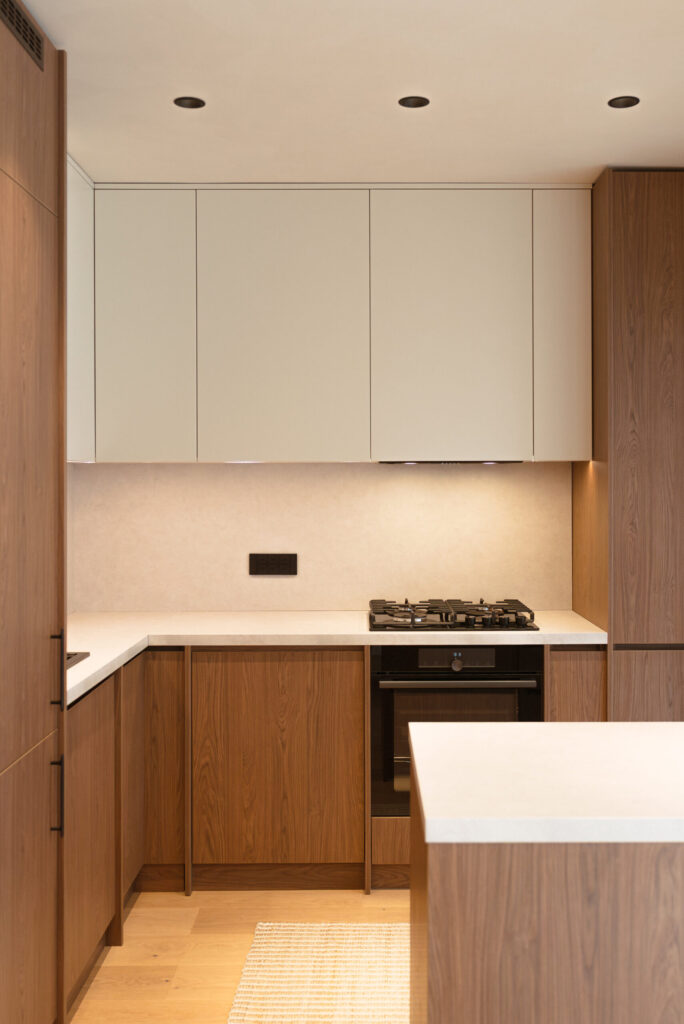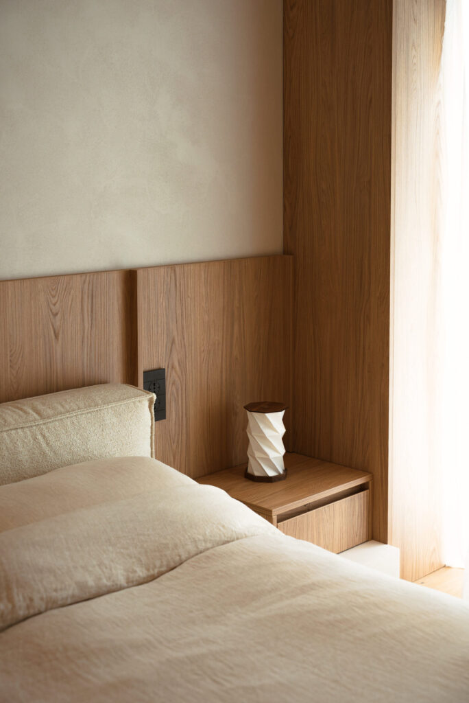 Texturile joacă un rol central în acest apartament. Finisajele minerale, cu aspect ușor imperfect, aduc un sentiment de autenticitate. Lemnul, lăsat cât mai natural, făr tratamente lucioase, adaugă căldură. Textilele sunt brute, simple, în nuanțe calme, și completează decorul fără să atragă excesiv atenția. Toate aceste materiale creează o atmosferă calmă, aproape atemporală, în care te simți protejat de agitația orașului.