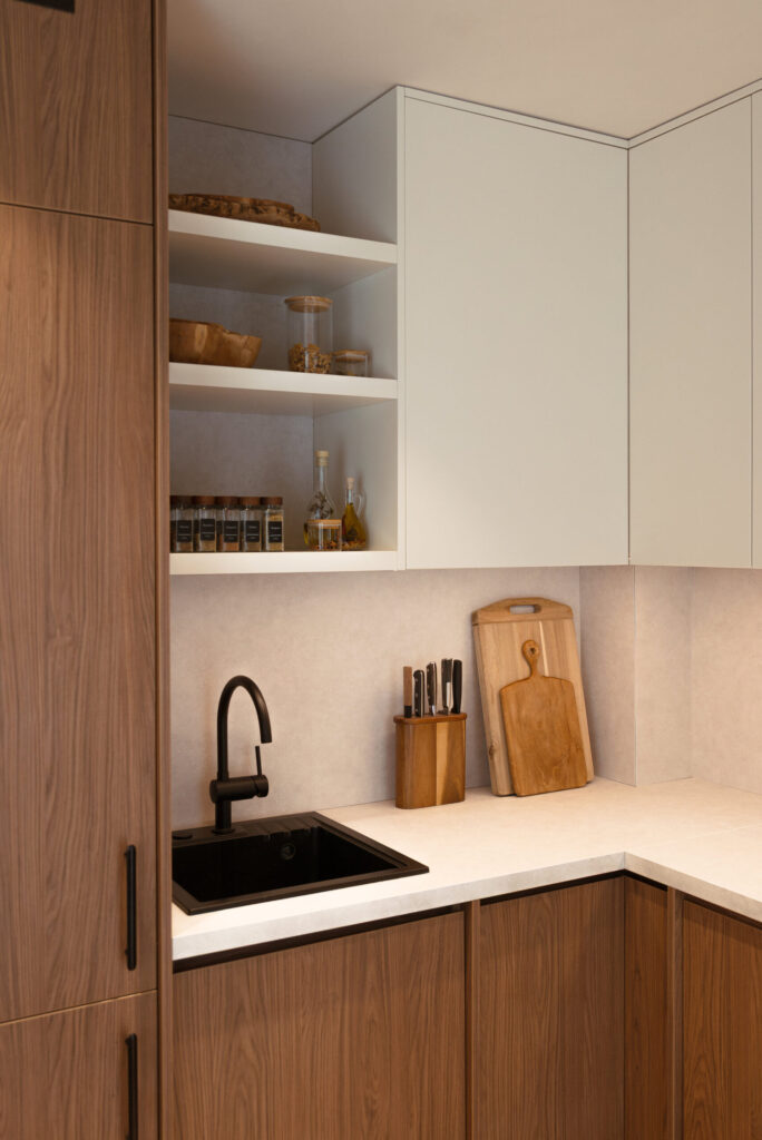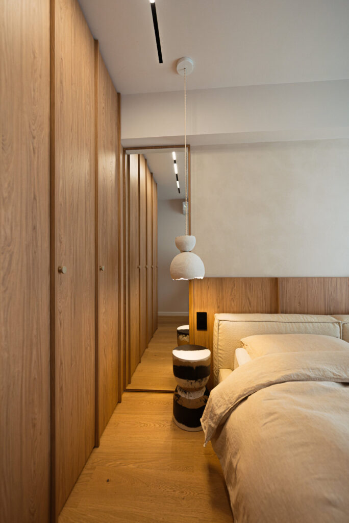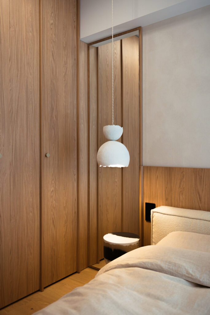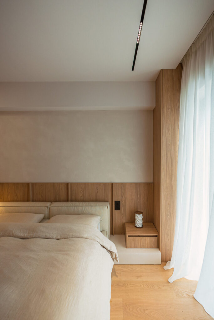 Un alt lucru care definește acest apartament este discreția. Proiectul evită gesturile spectaculoase sau elementele care vor să impresioneze imediat. În schimb, mizează pe o estetică a simplității și a retragerii. Fiecare spațiu este gândit pentru a susține starea de liniște și prezență. Este un loc care te invită să te oprești, să respiri și să te bucuri de moment.