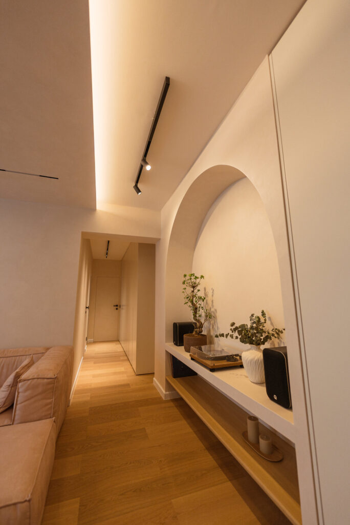 De la primul pas în interior, simți că spațiul a fost gândit cu blândețe. Liniile dure și colțurile ascuțite au fost înlocuite de forme rotunjite, arcade ample și detalii care par modelate direct în pereți. Aceste forme nu fragmentează apartamentul, ci îl fac să curgă firesc dintr-o zonă în alta. Livingul, zona de dining și celelalte spații funcționale sunt bine definite, dar fără delimitări rigide. Totul pare conectat, fluid și natural.