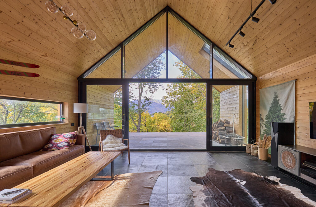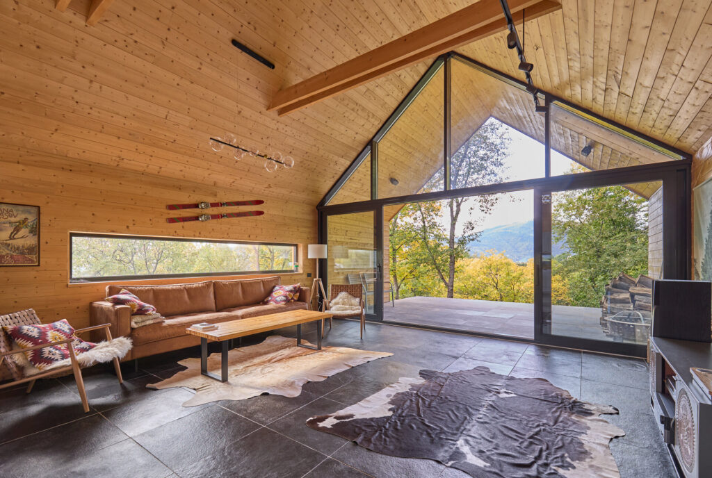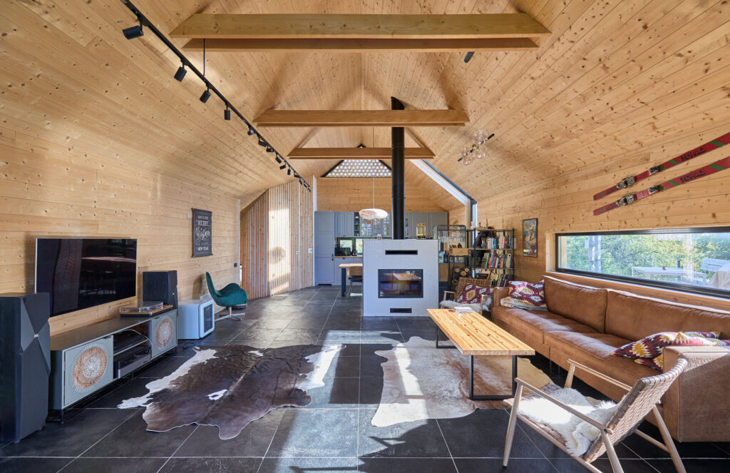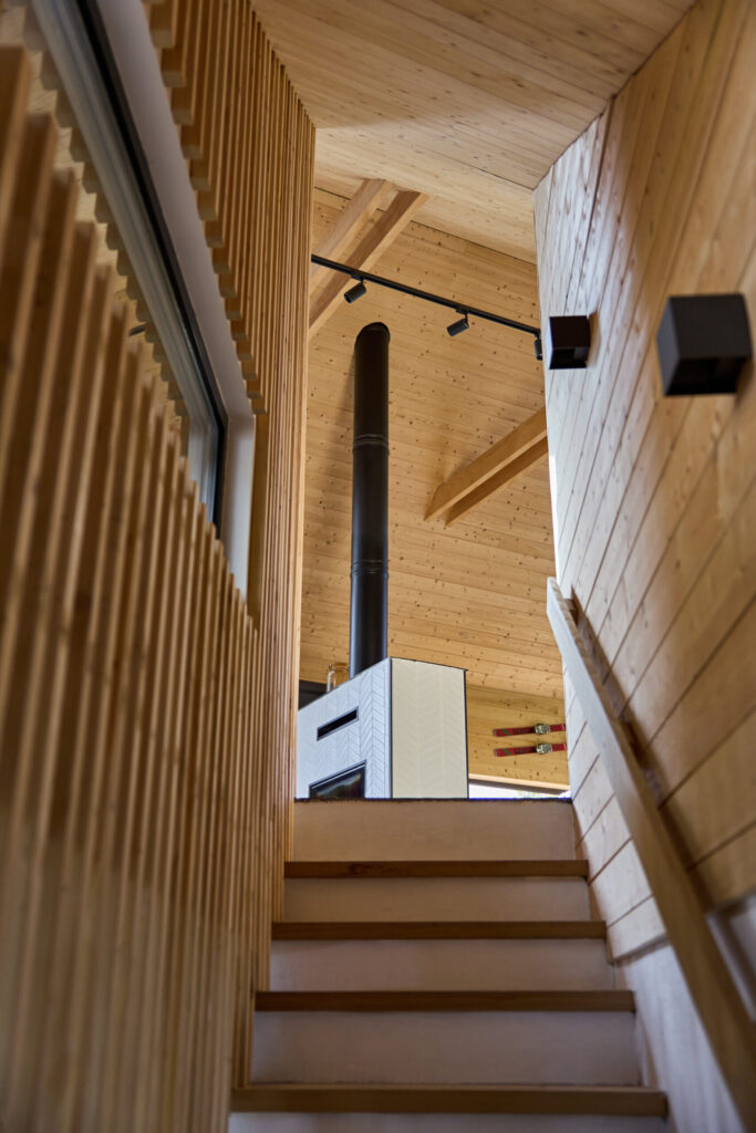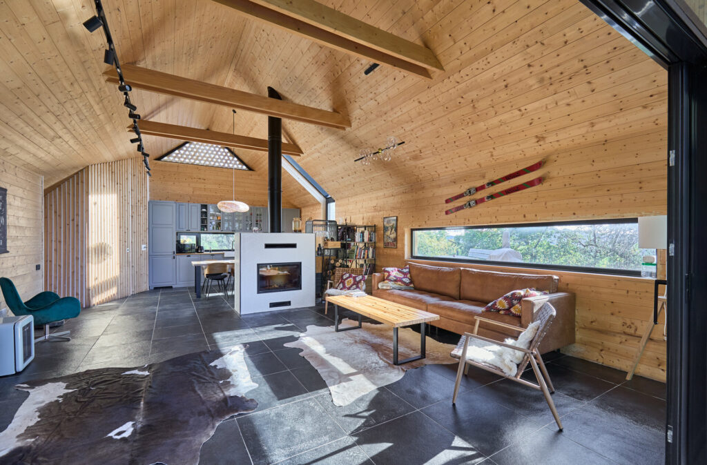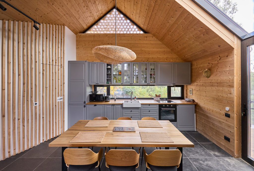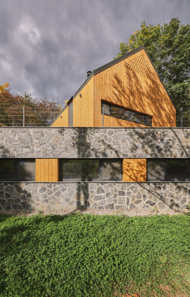 Deasupra acestei baze solide din piatră se află zona de zi, o construcție din lemn, luminoasă și deschisă. Aici se găsesc livingul, bucătăria și spațiile comune, locurile unde familia petrece cel mai mult timp. Lemnul aduce căldură, confort și o legătură vizuală directă cu natura din jur. Ferestrele mari lasă lumina naturală să pătrundă din plin și oferă priveliști frumoase către peisajul montan.