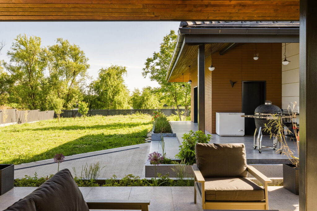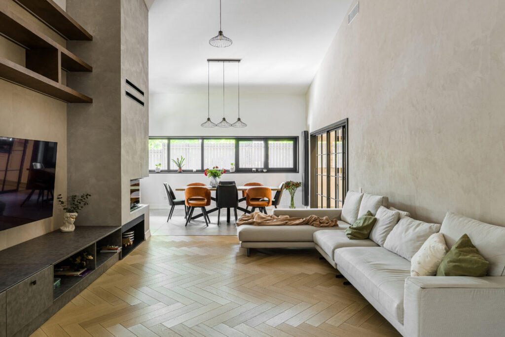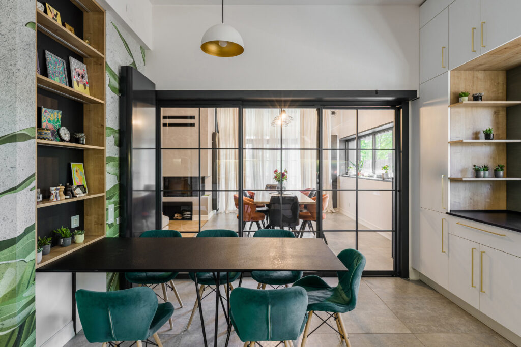 Zona de zi este amplă și luminoasă, iar terasa acoperită extinde spațiul interior spre grădină. Este atât un loc de tranziție între casă și natură, cât și un spațiu de întâlnire pentru familie. Bucătăria, parțial separată de zona de zi prin panouri vitrate culisante, păstrează legătura vizuală cu restul casei, dar oferă și intimitate. Mobilierul realizat la comandă și detaliile din alamă adaugă un plus de rafinament și căldură.