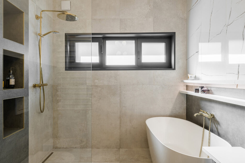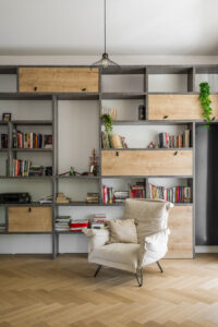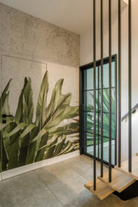 Până și circulațiile și spațiile intermediare au fost gândite cu atenție: mobilier integrat, lumini discrete și finisaje fine transformă holurile în spații de respiro. Băile combină funcționalitatea cu eleganța, prin plăci ceramice grafice și texturi naturale, care completează estetica generală.