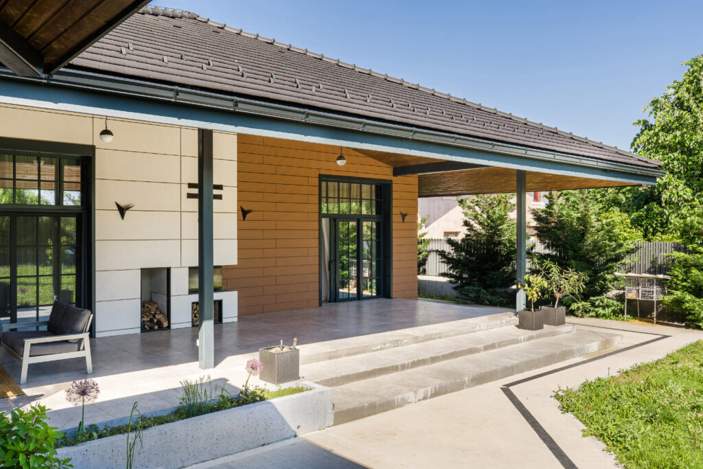 Fațada ventilată din ceramică, în nuanțe pământii și calde, oferă casei un aer calm și tactil. Aceleași tonuri naturale se regăsesc și la interior, unde lemnul, texturile minerale și materialele moi construiesc o atmosferă caldă și relaxantă. Arhitectura și designul interior urmează aceeași idee, un limbaj coerent, al calmului și echilibrului.