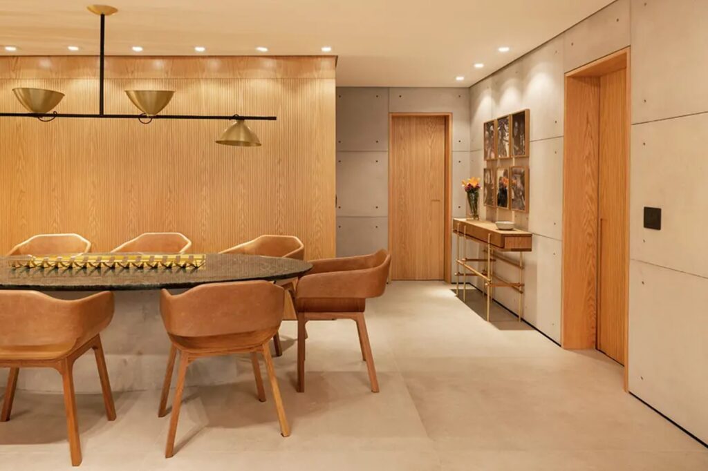 Lemnul este elementul care oferă identitate întregului proiect. Acesta apare încă de la intrare și continuă în zona de dining și pe hol. Un perete care închidea anterior accesul spre dormitoare a fost demolat și înlocuit cu lamele verticale din lemn. Acestea permit trecerea luminii și creează un sentiment de spațiu deschis, păstrând în același timp intimitatea necesară.