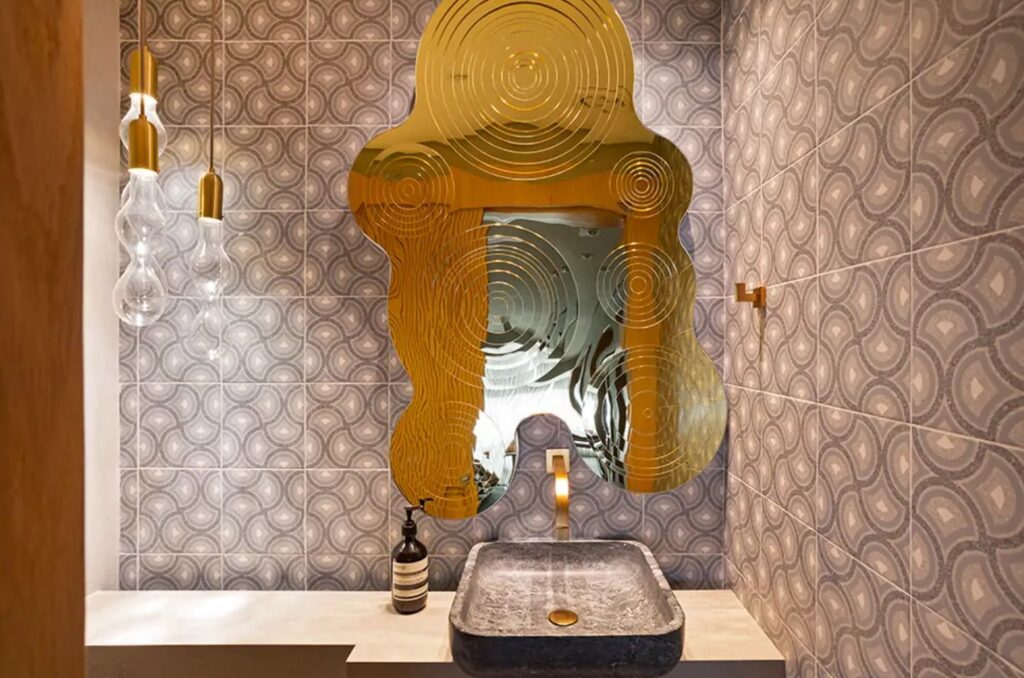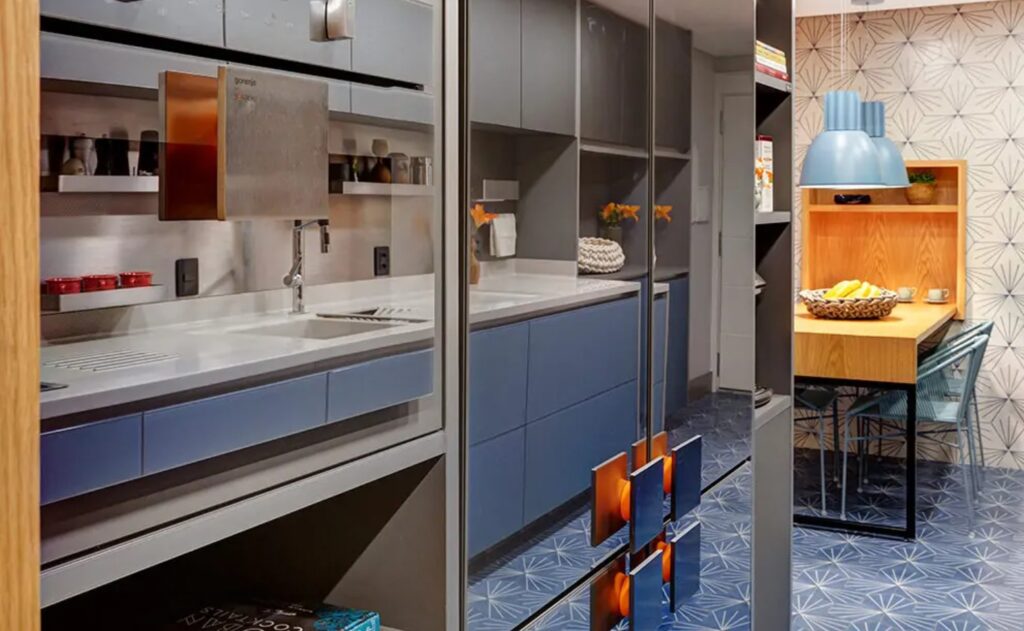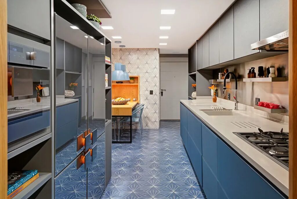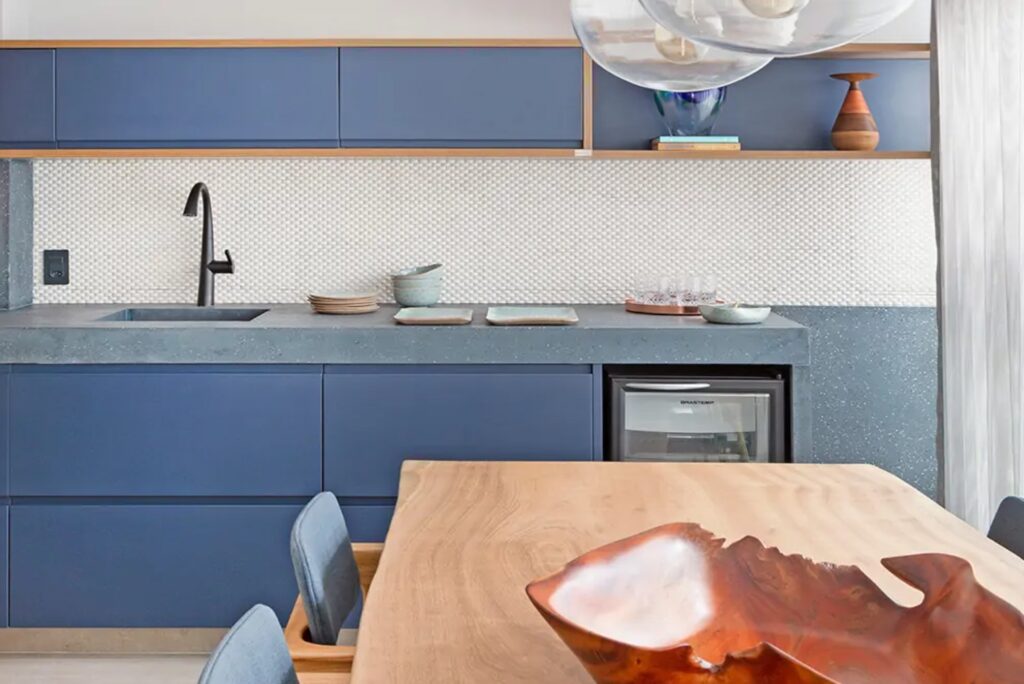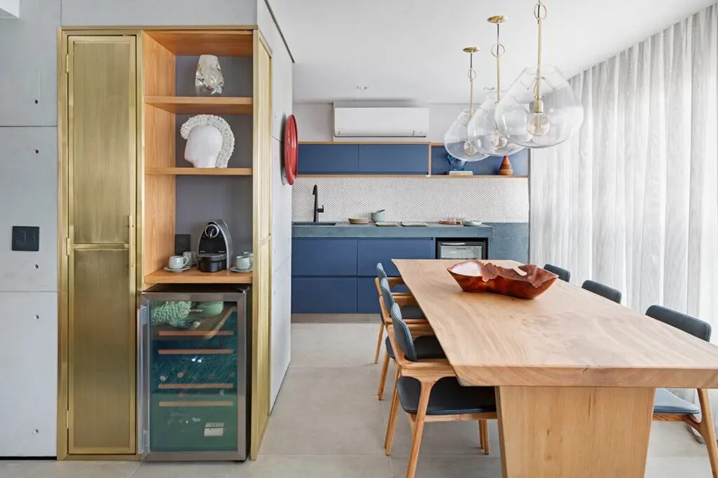 Zona gourmet se remarcă prin curajul alegerilor cromatice. Nuanțele de albastru și auriu se combină armonios cu lemnul și betonul folosite în mobilier și placările de perete. În restul încăperii apar accente de verde și caramel, care completează paleta de culori și aduc căldură spațiului.