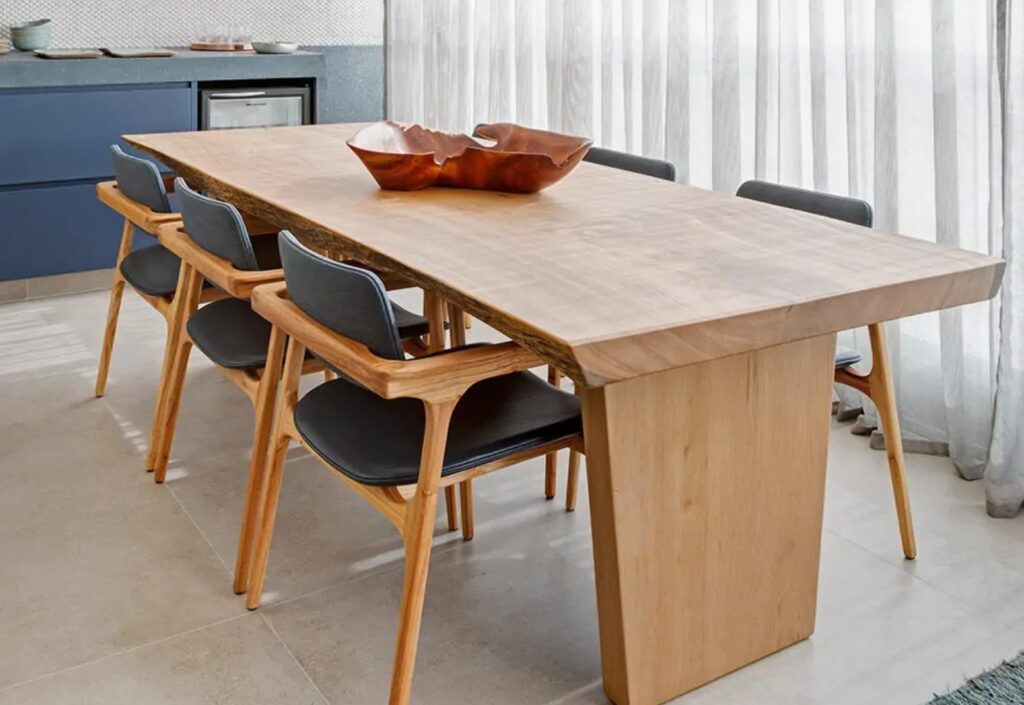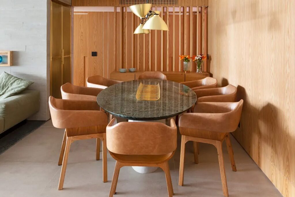 Un detaliu care atrage imediat atenția este contrastul dintre lambriul din lemn din zona mesei și lamelele din beton din living. Această alternanță de texturi adaugă profunzime și personalitate interiorului. Mobilierul realizat la comandă, finisajele bine executate și iluminatul corect poziționat contribuie la un ambient modern, dar primitor.