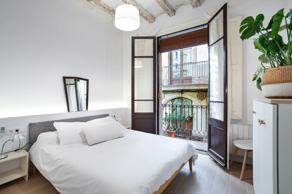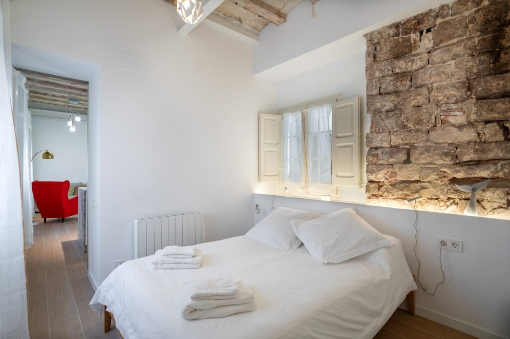 Trecerea spre dormitor păstrează aceeași atmosferă luminoasă. Aici, detaliul care atrage imediat privirea este porțiunea de zidărie veche, lăsată intenționat expusă. Piatra originală, cu nuanțele sale naturale, oferă un aer de autenticitate și spune povestea casei. Ferestrele cu obloane din lemn, restaurate, adaugă un plus de farmec tradițional, iar iluminarea indirectă subliniază textura zidului vechi, transformându-l într-o piesă decorativă în sine.
