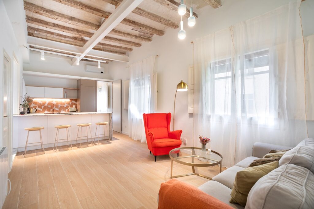 Fotoliul roșu, vibrant, devine centrul vizual al încăperii și aduce energie spațiului. Draperiile semitransparente filtrează lumina, accentuând senzația de lejeritate. Și aici, tavanul cu grinzi vechi rămâne elementul care leagă totul, amintind de trecutul locuinței și contrastând cu restul mobilierului modern.
