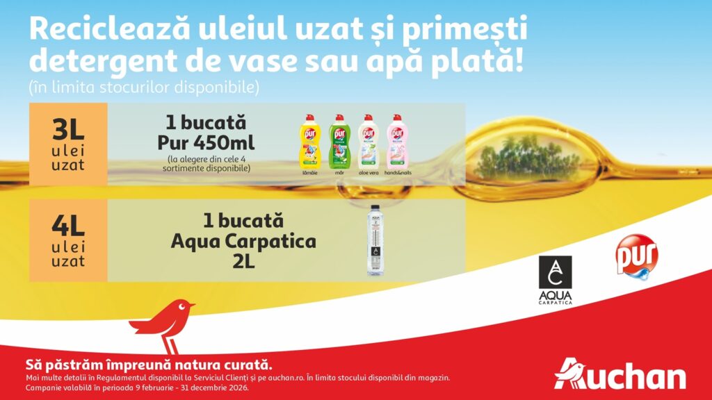 Tot mai mult ulei alimentar uzat se reciclează: Auchan a primit peste 1,7 milioane de litri în decurs de 7 ani 18 februarie 2026 | Noutăți | Anamaria Ostafe Distribuie articolul pe: Auchan România continuă dezvoltarea unuia dintre cele mai ample programe de economie circulară din retailul românesc, lansat în premieră la nivel local în 2019. Prin programul de colectare a uleiului alimentar uzat de la consumatorii casnici, compania a ajuns la un total de peste 1,7 milioane de litri colectați și predați pentru reciclare, aproape un sfert din această cantitate fiind adusă de clienți doar pe parcursul anului trecut. Ce beneficii primesc clienții care reciclează uleiul în magazinele Auchan și ATAC Auchan Cluj Nord, Militari și Berceni, în topul magazinelor cu cele mai mari cantități colectate Pentru a încuraja reciclarea uleiului de gătit și un comportament de consum mai responsabil, Auchan România, alături de partenerii săi, recompensează gestul clienților care predau uleiul alimentar uzat în hipermarketurile și supermarketurile Auchan și ATAC, în funcție de cantitatea colectată. Inițiativa este susținută prin parteneriate cu Henkel și Valvis, astfel că, de la minimum 3 litri de ulei predat, clienții pot primi la schimb un detergent de vase Pur 450 ml sau o sticlă de apă plată Aqua Carpatica de 2 litri. Uleiul alimentar uzat colectat este predat spre reciclare și transformat ulterior în biocombustibil. Cum se colectează corect uleiul alimentar uzat Uleiul alimentar uzat se transferă, după răcire, într-un recipient transparent din plastic, cu volum de 1, 2 sau 3 litri, ori multiplu de un litru. Pentru ca reciclarea să se realizeze în condiții optime, uleiul trebuie strecurat și nu trebuie amestecat cu alte tipuri de deșeuri. Recipientele pot fi predate la punctele Serviciu Clienți din hipermarketurile și supermarketurile Auchan și ATAC. În funcție de cantitatea predată, începând de la minimum 3 litri, clienții beneficiază de un produs gratuit, în limita stocurilor disponibile. Doar în 2025, Auchan România a colectat peste 400.000 de litri de ulei alimentar uzat, contribuind astfel la salvarea de la contaminare a peste 400 de miliarde de litri de apă. „Deși impactul uleiului alimentar uzat asupra mediului este major, colectarea lui rămâne încă limitată la nivel național. Experiența noastră arată că schimbarea este posibilă atunci când există infrastructură accesibilă, parteneriate și un mecanism care încurajează implicarea clienților. Le mulțumim partenerilor noștri care s-au alăturat acestui efort colectiv și ne dorim ca astfel de inițiative să se multiplice și să fie susținute prin colaborare între Auchan, partenerii săi și consumatori, pentru ca reciclarea uleiului să devină o practică obișnuită, la scară cât mai mare”, a declarat Corina Dospinoiu-Imre, Director Sustenabilitate Auchan România. „Fiecare litru de ulei colectat înseamnă mai puțină poluare și mai multă grijă față de natură. Ne bucurăm să fim alături de Auchan într-un proiect care dovedește că binele comun începe cu gesturi mici, făcute conștient. Pentru AQUA Carpatica, protejarea purității apei și a mediului este parte din ceea ce ne definește. Înseamnă mai mult decât o promisiune – este o responsabilitate asumată zi de zi”, a declarat Valentina Vesler, Director de Comunicare și PR, AQUA Carpatica. „Am observat un interes tot mai crescut al consumatorilor pentru soluții responsabile și pentru inițiative care contribuie concret la protejarea mediului. Prin implicarea brandului Pur în acest proiect, ne dorim să susținem comportamentele sustenabile și să încurajăm gesturile simple, dar cu impact major, precum reciclarea uleiului alimentar uzat. Preocuparea pentru impactul asupra mediului se reflectă tot mai puternic în activitatea noastră și în modul în care dezvoltăm produse și parteneriate, iar colaborarea cu Auchan reprezintă un exemplu concret, care aduce beneficii reale comunităților”, a declarat Sînziana Plămădeală, Brand Manager Pur, Henkel România. De la lansarea proiectului în urmă cu 7 ani, Auchan, alături de partenerii săi, a oferit peste 1,4 milioane de produse drept beneficii clienților, iar numărul persoanelor care reciclează ulei a depășit 1,3 milioane. Topul magazinelor cu cele mai mari cantități colectate anul trecut include Cluj Nord, Militari, Berceni, Galați și Satu Mare. Uleiul colectat în cadrul programului este preluat de un partener specializat de colectare, care asigură transportul și prelucrarea inițială în procesul pentru transformarea uleiului uzat în biocombustibil, proces prin care se evită contaminarea apei și se reduc emisiile de carbon. Despre Auchan România La 20 de ani de la deschiderea primului hipermarket pe plan local, Auchan România are în portofoliu peste 500 de magazine, cuprinzând 26 de hipermarketuri clasice, 9 hipermarketuri ATAC Hiper Discount, 9 supermarketuri, magazinul inteligent Auchan Go, aproape 400 de magazine de ultra-proximitate MyAuchan, din care majoritatea în stațiile Petrom, peste 70 de magazine în franciză Simply by Auchan, precum și magazinul online auchan.ro. Cu o cifră de afaceri cu taxe în 2024 de peste 1,7 miliarde de Euro, Auchan propune locuitorilor din orașele în care sunt prezente magazinele sale un comerţ omnicanal, modern, de calitate, cu cele mai largi game de produse şi un concept de discount responsabil, cu toate preţurile mici, în fiecare zi. Articol susținut de Auchan. Distribuie articolul pe: Anamaria Ostafe