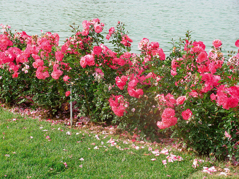 Trandafirii arbuști fac tufe foarte frumoase. Arată bine cultivați pe spații mari, cu gazon. Dacă în vecinătate se află și o apă (de preferință, marea), decorul capătă un aer romantic cuceritor. Trandafirii arbuști din imagine sunt foarte potriviți pentru un astfel de decor, având talie joasă, port compact și o înflorire bogată.