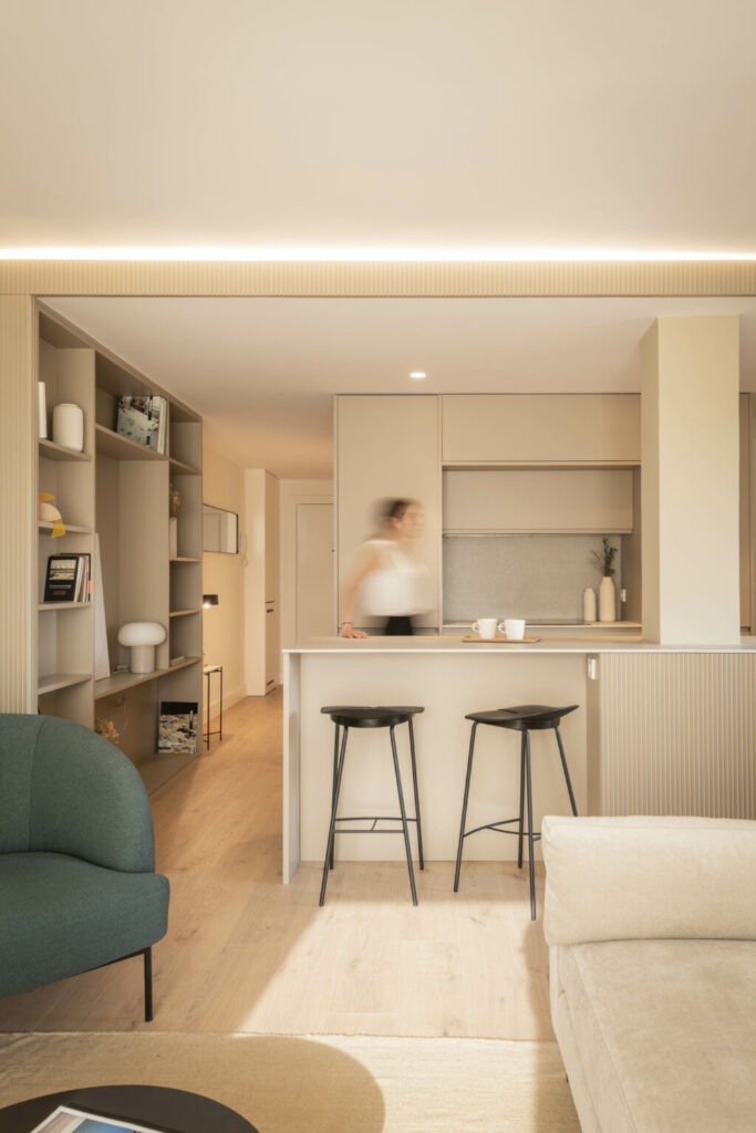 Foto: alvarezsotelo.com Un apartament comun se transformă într-un loc flexibil și luminos, după reamenajare 5 ianuarie 2026 | Case și amenajări | Petri Radulescu Distribuie articolul pe: Acest proiect pornește din dorința unui cuplu fără copii de a-și transforma apartamentul într-un spațiu cu adevărat personal. În loc să caute o altă locuință, cei doi au ales să investească economiile într-o reamenajare completă, gândită atent, în care fiecare detaliu să răspundă stilului lor de viață și nevoilor zilnice. În forma inițială, apartamentul avea o compartimentare clasică, dar prea fragmentată. Geometria triunghiulară a clădirii a dus la un plan rigid, cu trei dormitoare, două băi și o bucătărie separată, fără legături fluide între spații și cu puțină flexibilitate în utilizare. Noua propunere de amenajare a reorganizat locuința în trei benzi orizontale, fiecare cu un rol clar. Zona de noapte cuprinde dormitoarele și spațiile umede, precum băile. Zona de zi este dedicată livingului și diningului, iar banda centrală – care include bucătăria și spațiile de depozitare – funcționează ca un element de legătură între cele două. Designul interior s-a bazat pe o selecție riguroasă a fiecărui element, de la mobilier și finisaje până la obiecte decorative și artă. Intervenția asupra zonei centrale a permis nu doar o organizare mai clară a casei în funcție de momentele zilei, ci și realizarea unor detalii rafinate, care îmbunătățesc atât funcționalitatea, cât și aspectul estetic al fiecărui spațiu. Această reorganizare a făcut posibilă și adăugarea unei ferestre suplimentare în living, deschizând priveliștea către dealurile Pardo. Zona de zi a devenit astfel mai luminoasă, mai aerisită și mult mai versatilă, adaptabilă diferitelor activități de zi cu zi. Bucătăria este integrată deschis în zona de living, dar își păstrează identitatea printr-o delimitare subtilă. Amplasată în banda centrală, aceasta este concepută ca o piesă modulară de mobilier: o bibliotecă ce funcționează ca zonă de tranziție, două module de bucătărie și un spațiu generos de depozitare. Rezultatul este un ansamblu fluid, coerent și practic. Forma triunghiulară a apartamentului a fost valorificată prin crearea unui spațiu trapezoidal, transformat într-un dressing walk-in, evidențiat printr-o pardoseală diferită. Ultima bandă găzduiește dormitorul matrimonial, cu baie proprie complet renovată, o a doua baie și zona de spălătorie. Un hol cu finisaje texturate leagă cele două zone principale, funcționând ca un fundal geometric care unifică vizual întregul apartament. Rezultatul este o locuință care transformă un apartament obișnuit într-un spațiu flexibil, luminos și coerent. Organizarea pe benzi orizontale, împreună cu alegerea atentă a materialelor și a mobilierului, creează un ambient armonios, adaptat vieții contemporane. Foto: alvarezsotelo.com CITEȘTE ȘI: Mixul de lemn, beton și culoare dă farmec amenajării acestui apartament Influențe retro într-o bucătărie contemporană Amenajare interioară în tonuri calde, construită în jurul tablourilor Distribuie articolul pe: Petri Radulescu