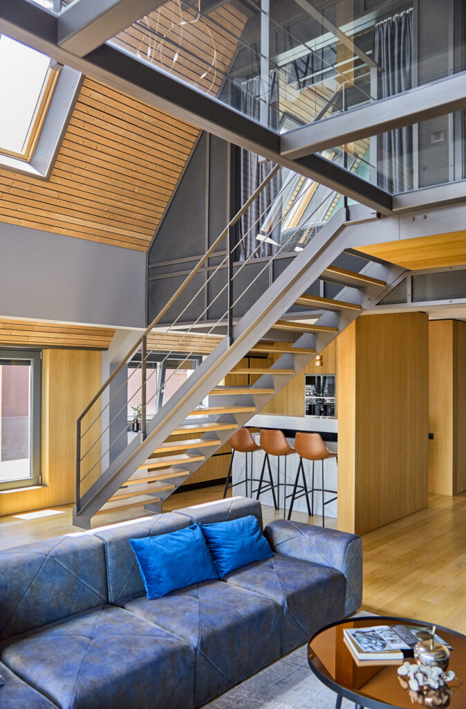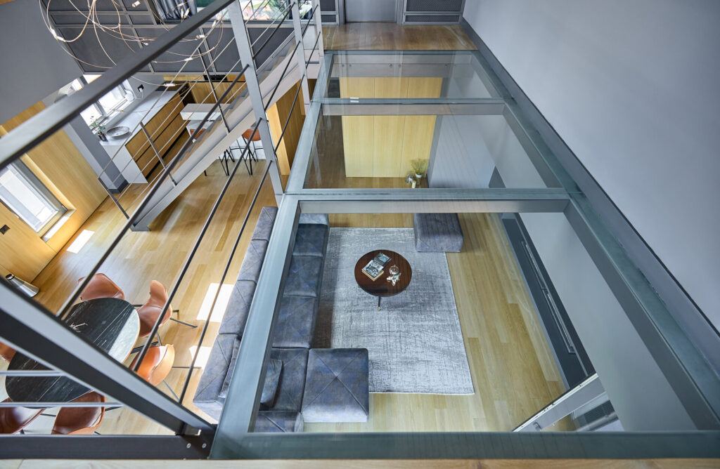 Acolo unde a fost nevoie de separare, pereții clasici au fost înlocuiți cu partiții ușoare. Acestea sugerează ideea de delimitare, dar nu închid complet spațiul. Rezulatul este un interior care este, în același timp, intim și deschis. Unele zone sunt mai retrase și mai protejate, în timp ce altele se dezvoltă pe dublă înălțime, accentuând caracterul de loft al apartamentului.