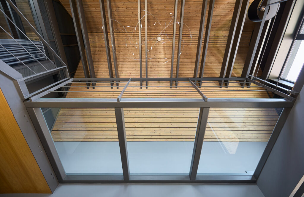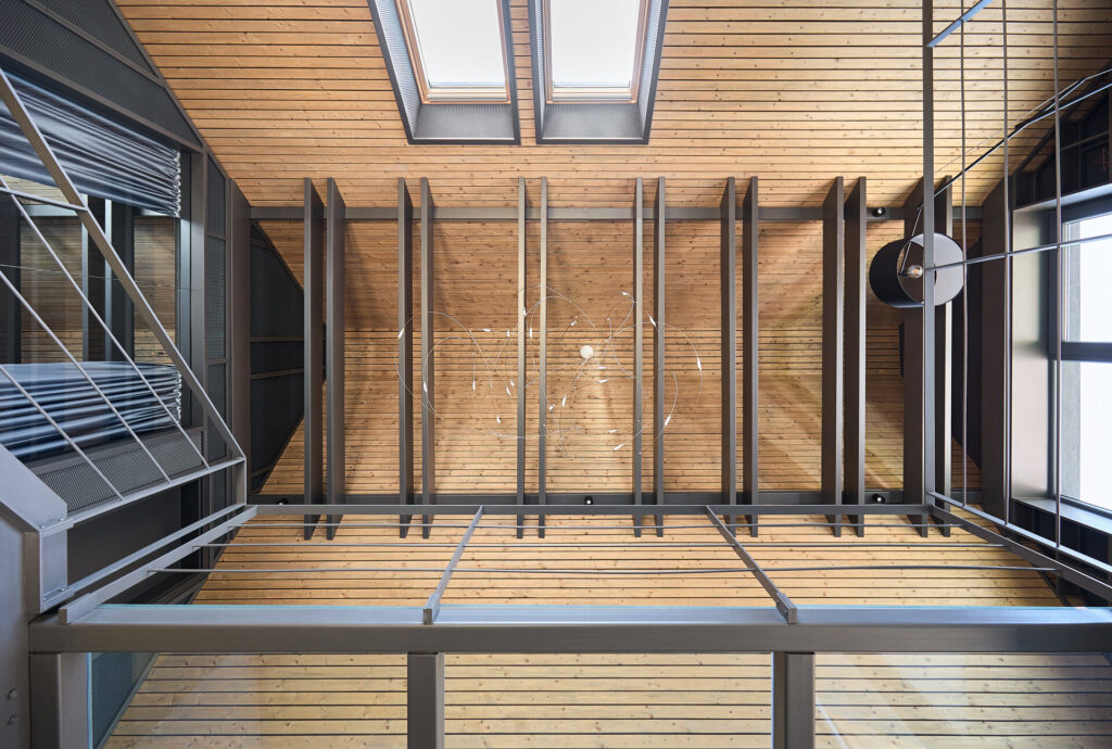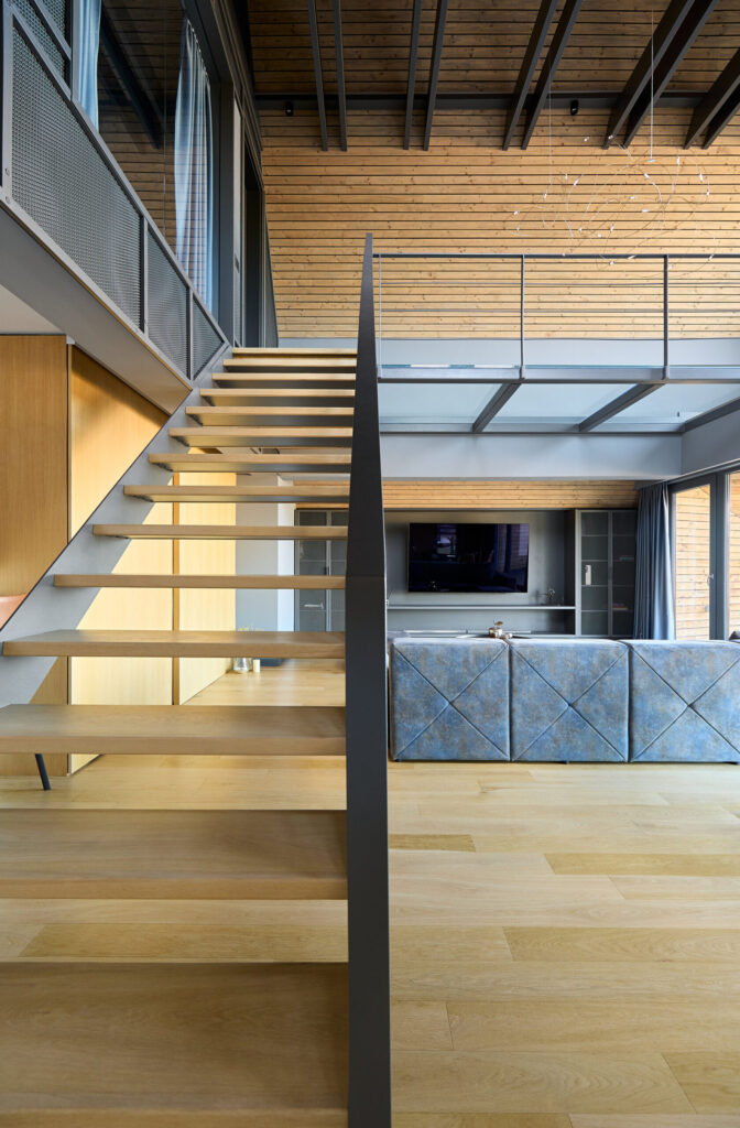 Un element cheie al amenajării este scara interioară. Aceasta face legătura între cele două niveluri și are un design simplu, discret, pentru a nu încărca vizual spațiul. Scara conduce către etajul superior, unde se află zona de noapte. Aici, dormitorul și o mică bibliotecă amplasată lângă fereastra cu vedere spre vale sunt conectate printr-o pasarelă transparentă, care păstrează senzația de deschidere și continuitate.