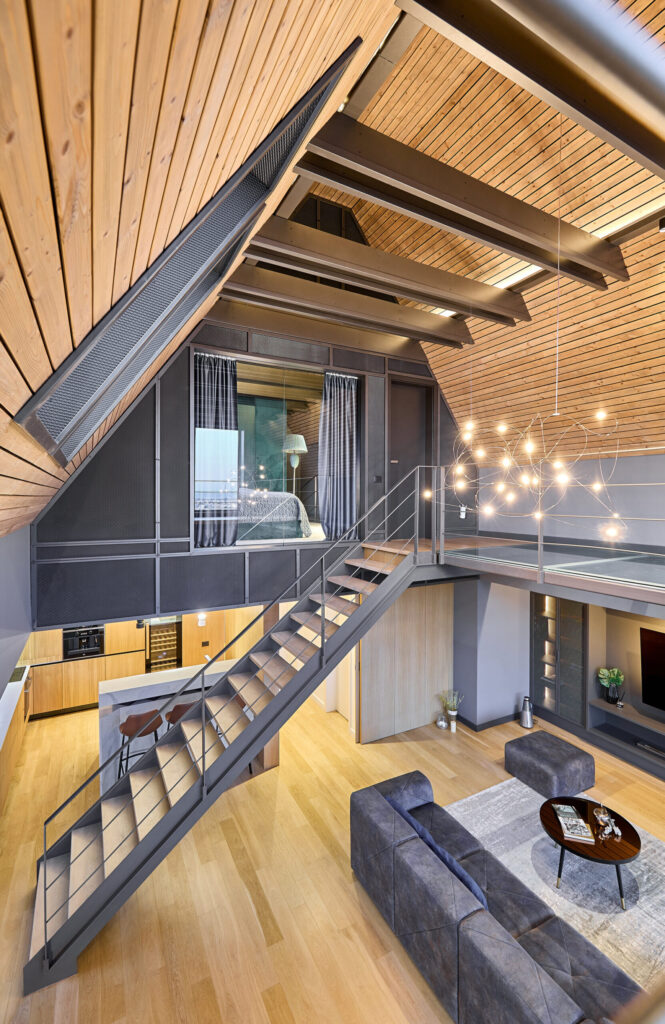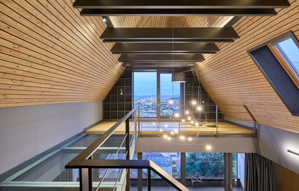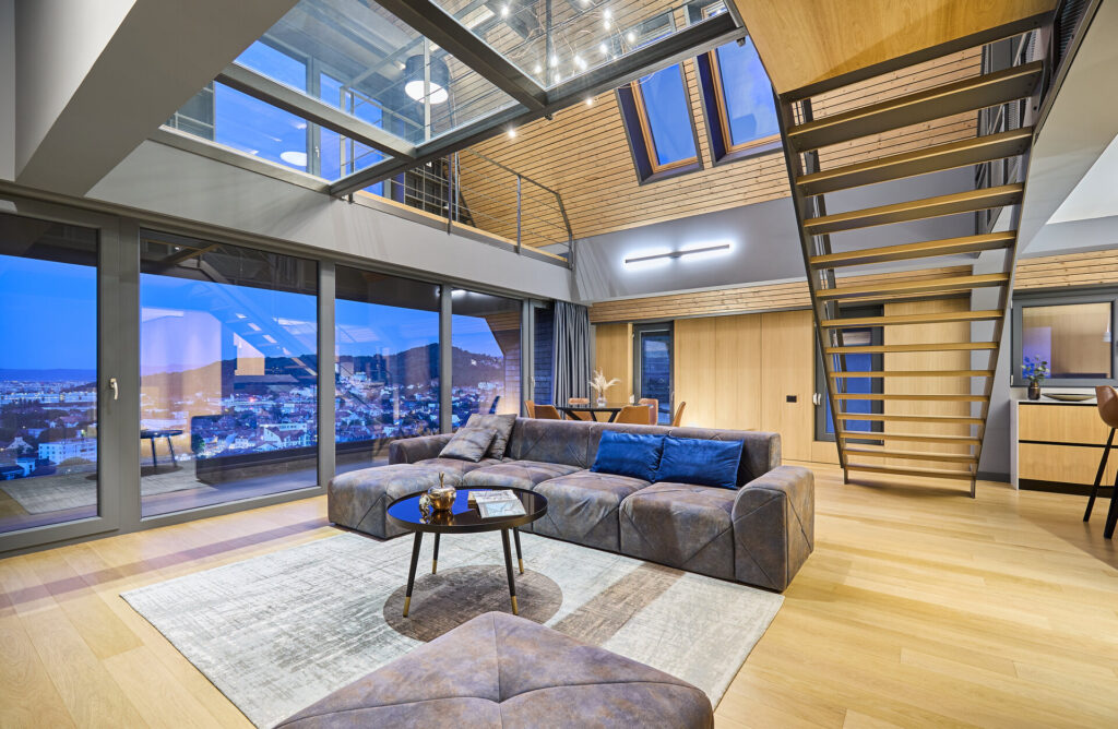 Situat pe Dealul Cetății, într-un imobil de locuințe, acest apartament de tip loft ocupă ultimele două niveluri ale clădirii și se bucură de o vedere panoramică spectaculoasă asupra orașului Brașov. De la primele momente, spațiul impresionează prin lumină, deschidere și felul în care structura clădirii devine elementul principal al amenajării.