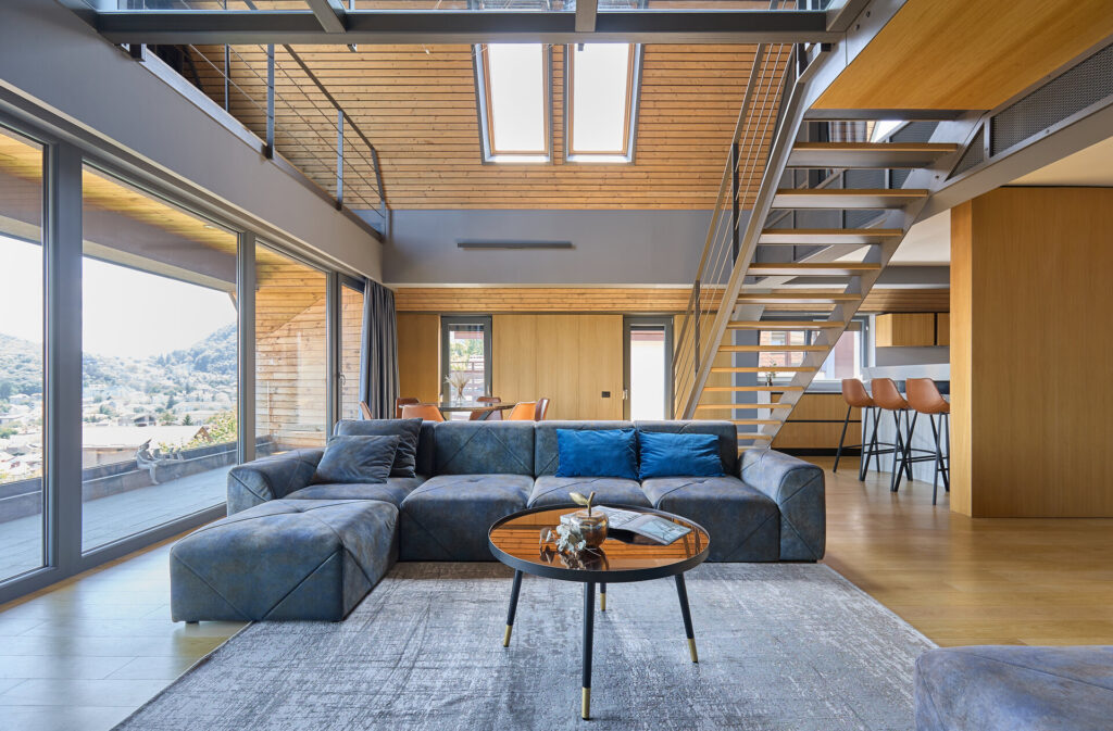 Conceptul de „open space” este folosit aici pentru a valorifica fiecare colț al apartamentului. Zonele de zi, de lucru sau de relaxare nu sunt închise strict, ci sunt diferențiate prin înălțimi diferite, materiale sau finisaje. Astfel, funcțiunile se disting clar, dar fără a pierde continuitatea spațiului. Lipsa pereților masivi permite luminii naturale să circule liber și să ajungă în toate zonele apartamentului.
