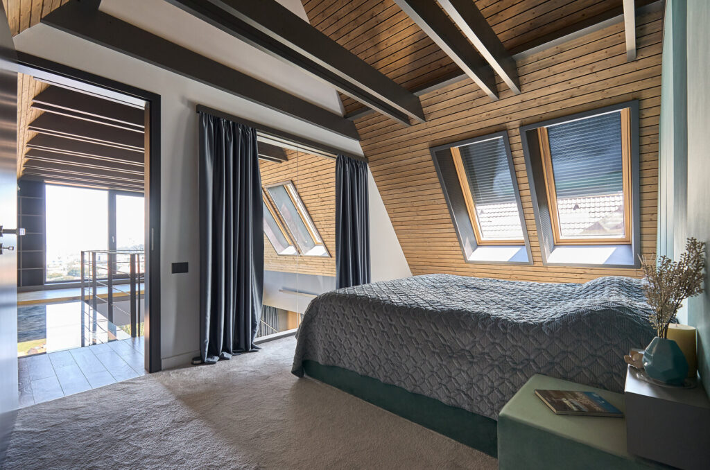 Dormitorul beneficiază de un perete parțial vitrat, care permite o legătură vizuală cu livingul de la nivelul inferior și, mai departe, cu panorama orașului. Această deschidere aduce lumină naturală și creează o relație directă între spațiile de zi și cele de odihnă, fără a compromite intimitatea.